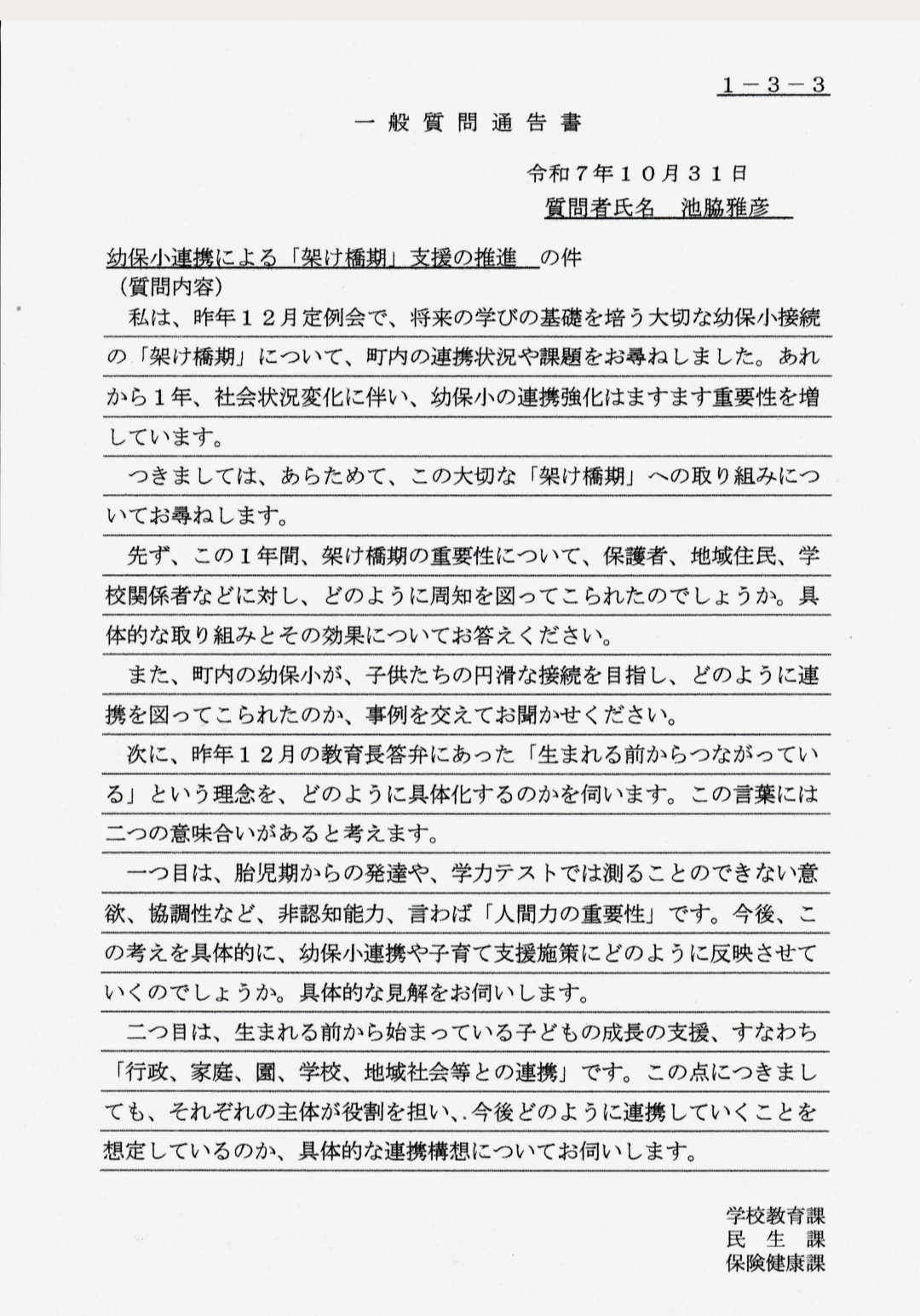 【第62回】12月定例会一般質問3問目「幼保小連携による『架け橋期』支援の推進」の答弁要旨についてご紹介します。