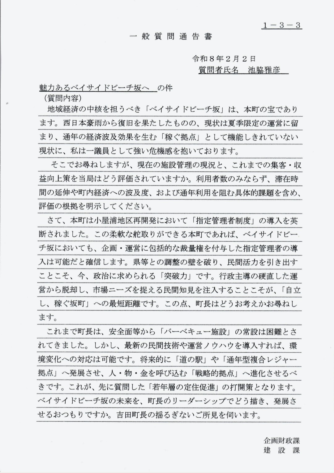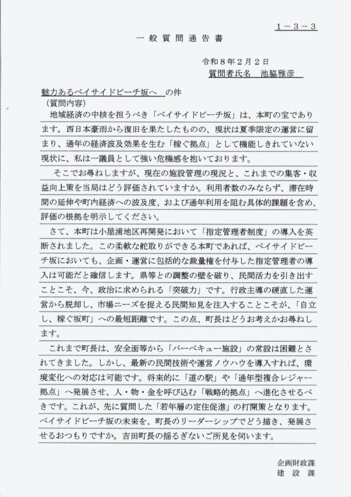 さて、お待たせしました。3月定例会一般質問③「魅力あるベイサイドビーチ坂へ」の発言通告書と町長答弁要旨についてご紹介します。
