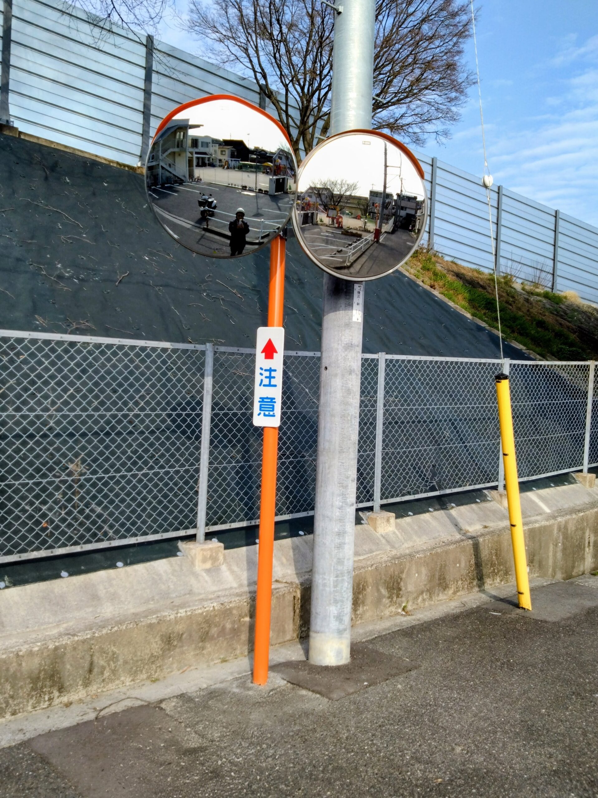 一般質問のご紹介の前に、最近の議員活動における成果についてお話します。それは横浜若竹こども園の駐車場の前にあるカーブミラー設置の件です。半年ほど前に、ある地域の方が園長さんから聞いた話として「現在、1基しかないカーブミラーでは死角になるところがあり、こども園駐車場の出入りが危険であるため、もう1基増設できないか」ということでした。つまり園長さんが大変困っておられるという相談でした。私はすぐ現場に行き、多方向から写真を撮り、先に関係課へメールで写真を送り、増設対応を関係課長に相談に伺いました。それが昨年9月下旬のことです。